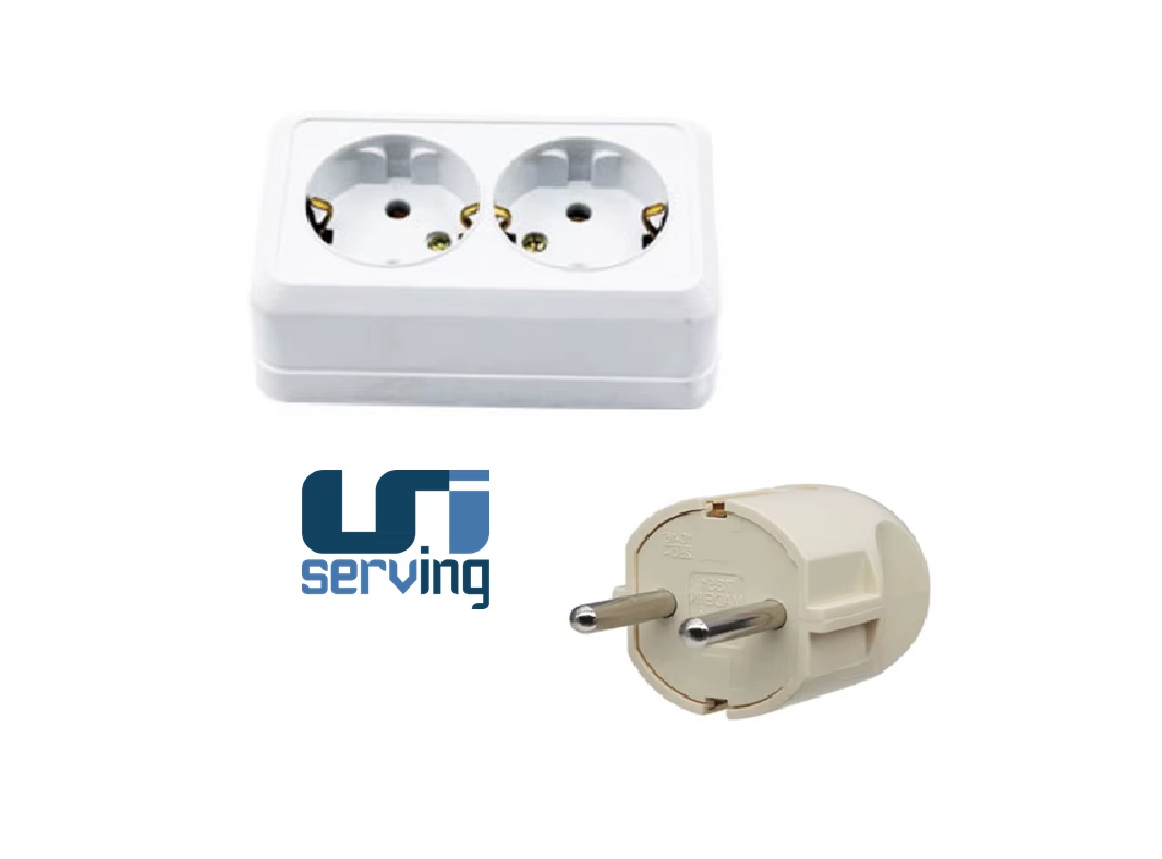Conector eléctrico marino no estanco tipo Siemens, compuesto por un enchufe y una doble toma de corriente de 2 clavijas redondas, este conjunto está diseñado para aplicaciones en entornos marinos, ofreciendo una solución robusta y confiable para la conexión de equipos eléctricos a bordo.